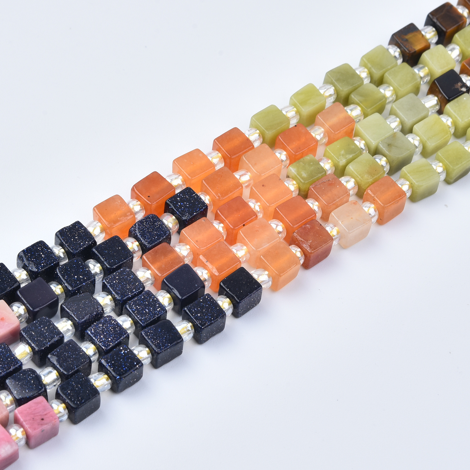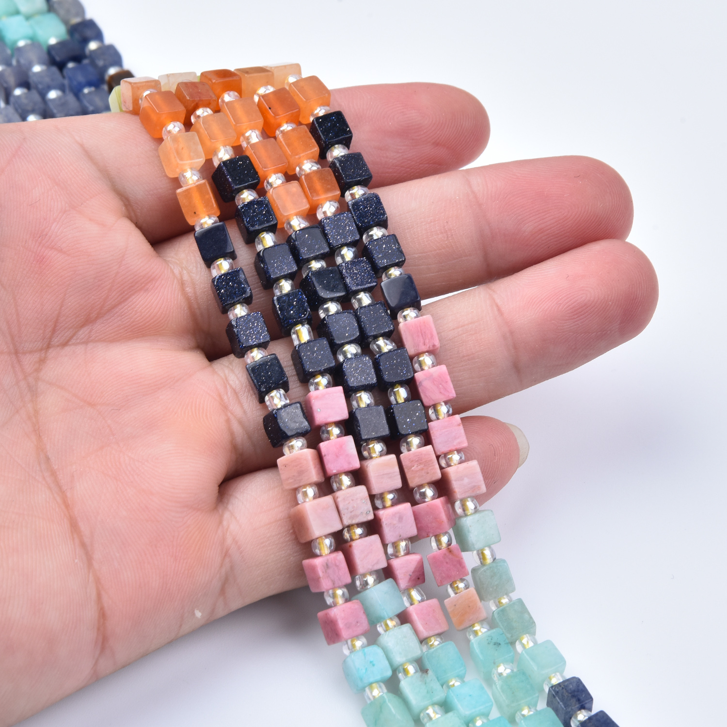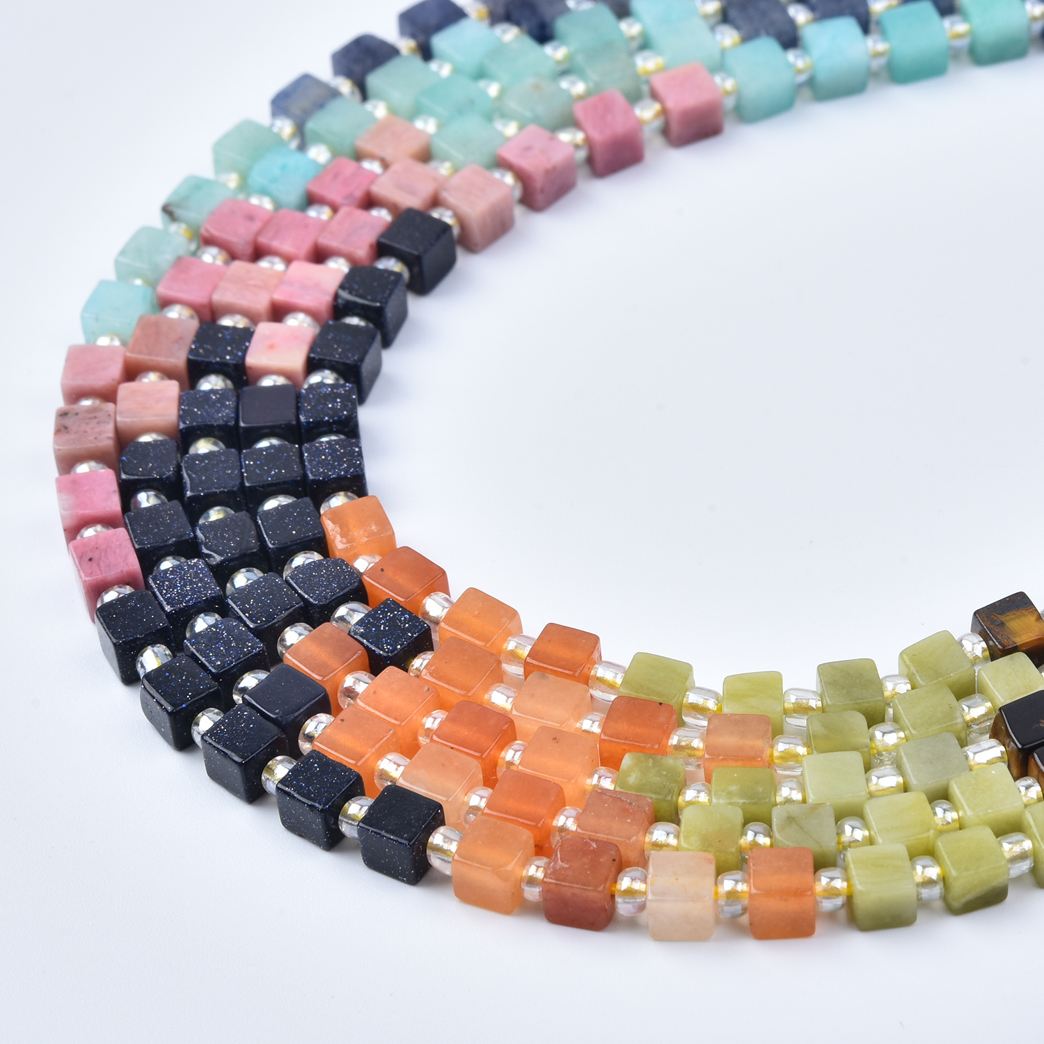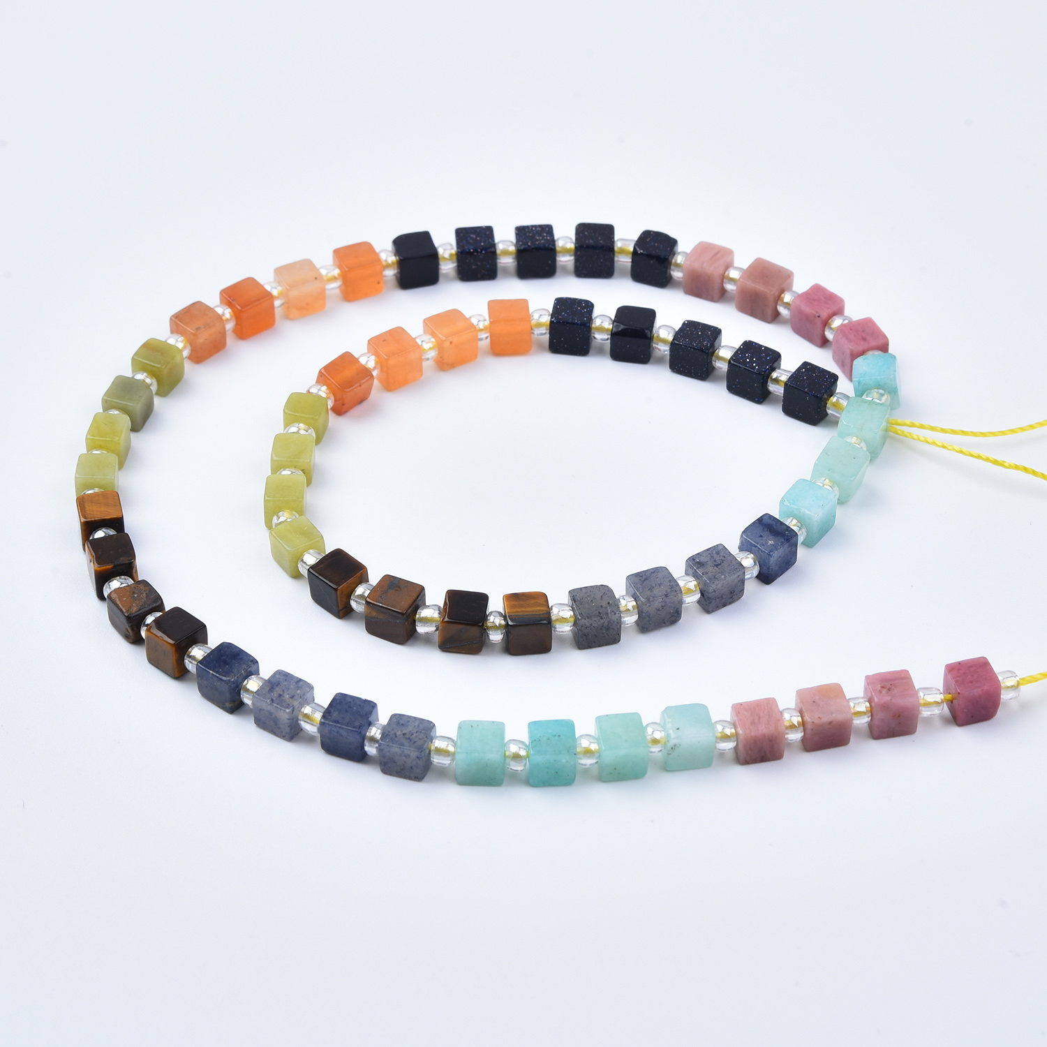 Bring rich earthy color and balanced energy to your jewelry creations with this 4mm Smooth Cube Gemstone Bead Strand Mix (GRN790). This full 15.5″ strand showcases a warm, expressive palette—soft aqua, dusty rose, inky black, honey orange, moss green, denim blue, and grounding brown—perfect for boho designs, chakra-inspired jewelry, and modern unisex pieces.