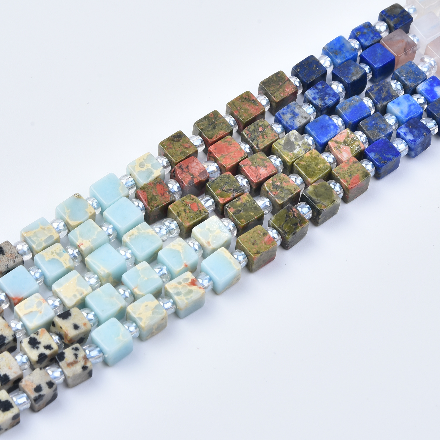 This strand offers a bold yet balanced color story with visual interest from both solid and patterned stones. The 4mm cube size is ideal for detailed designs, stacking bracelets, charm necklaces, and refined color transitions—making it a versatile choice for creative jewelry makers.