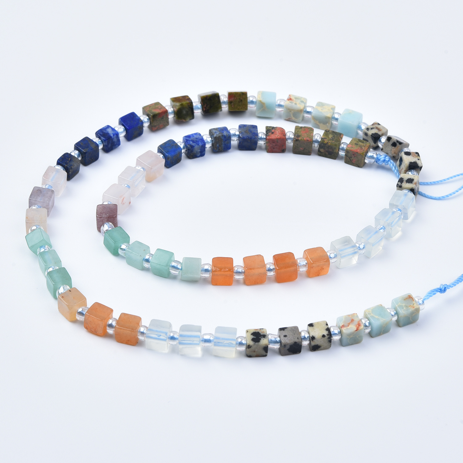 Bring vibrant contrast and earthy character to your jewelry designs with this 4mm Smooth Cube Mixed Gemstone Bead Strand (GRN800). This full 15.5″ strand features a lively, natural palette—deep lapis blue, soft aqua, warm orange, mossy green, creamy white, and distinctive spotted tones—perfect for boho jewelry, playful color-blocking, chakra pieces, and modern handmade designs.