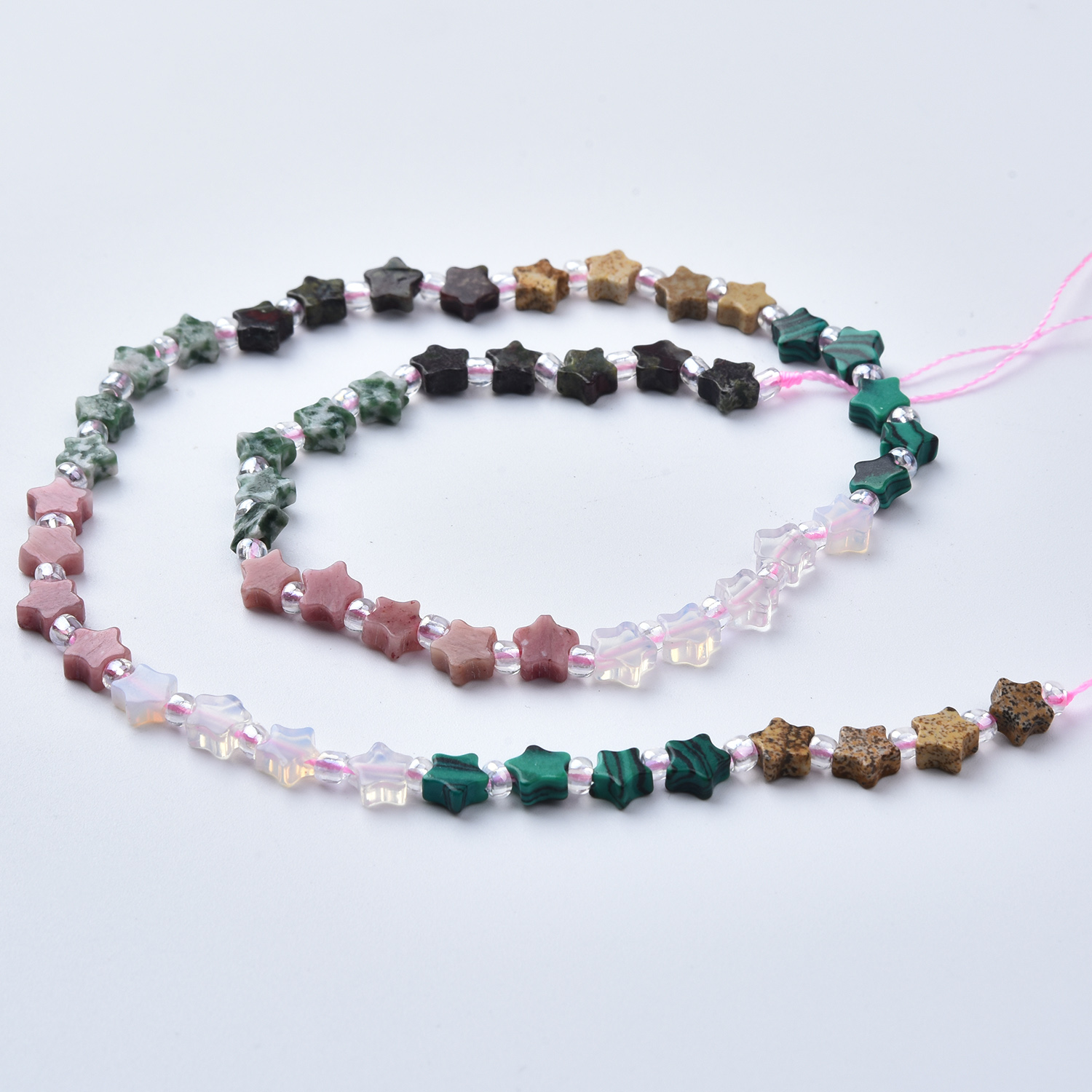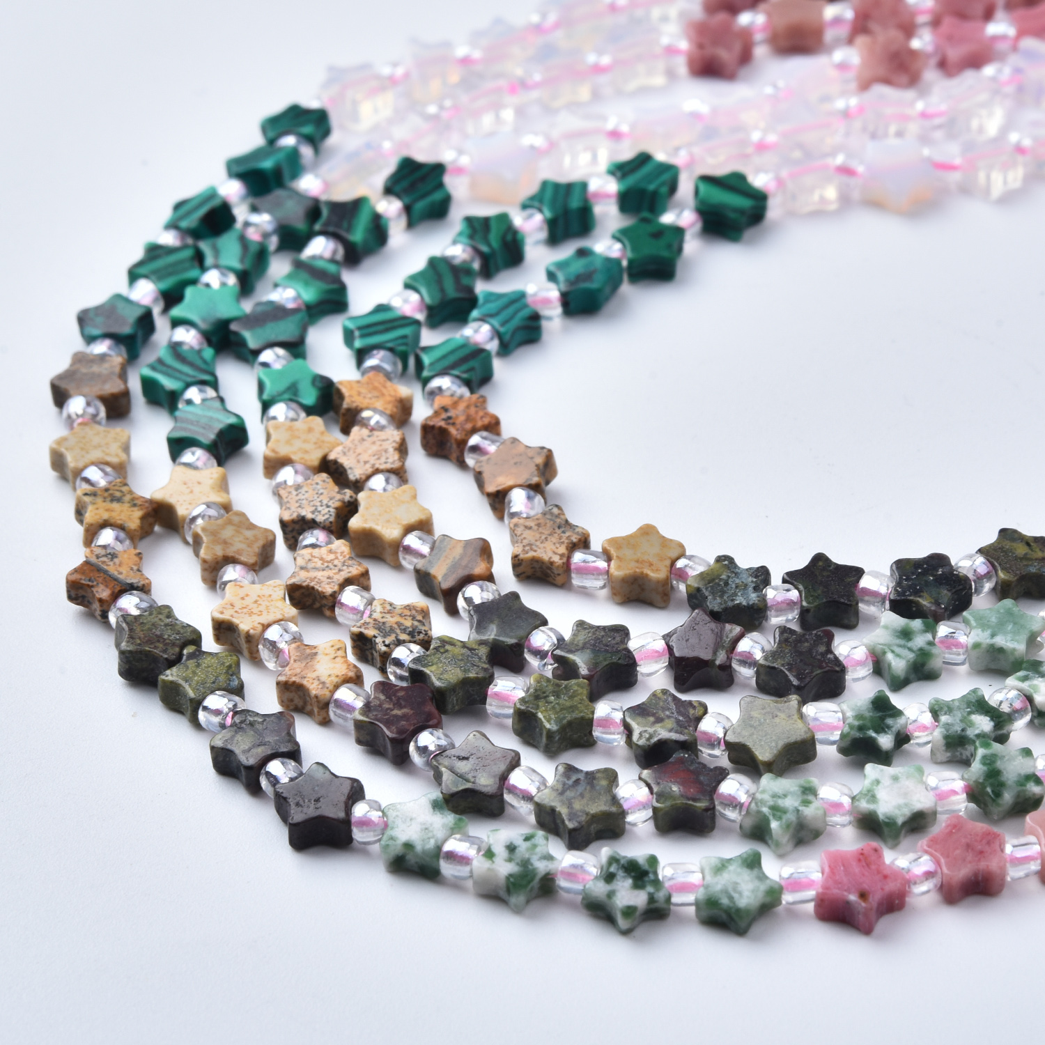 Make charming celestial designs with this 5mm star mixed gemstone bead strand. This mix includes banded green Malachite, soft pink Cherry Quartz-style stars, mottled green Moss Agate, and earthy Jasper/Agate tones, all separated with shiny spacer beads for a clean, sparkly look.