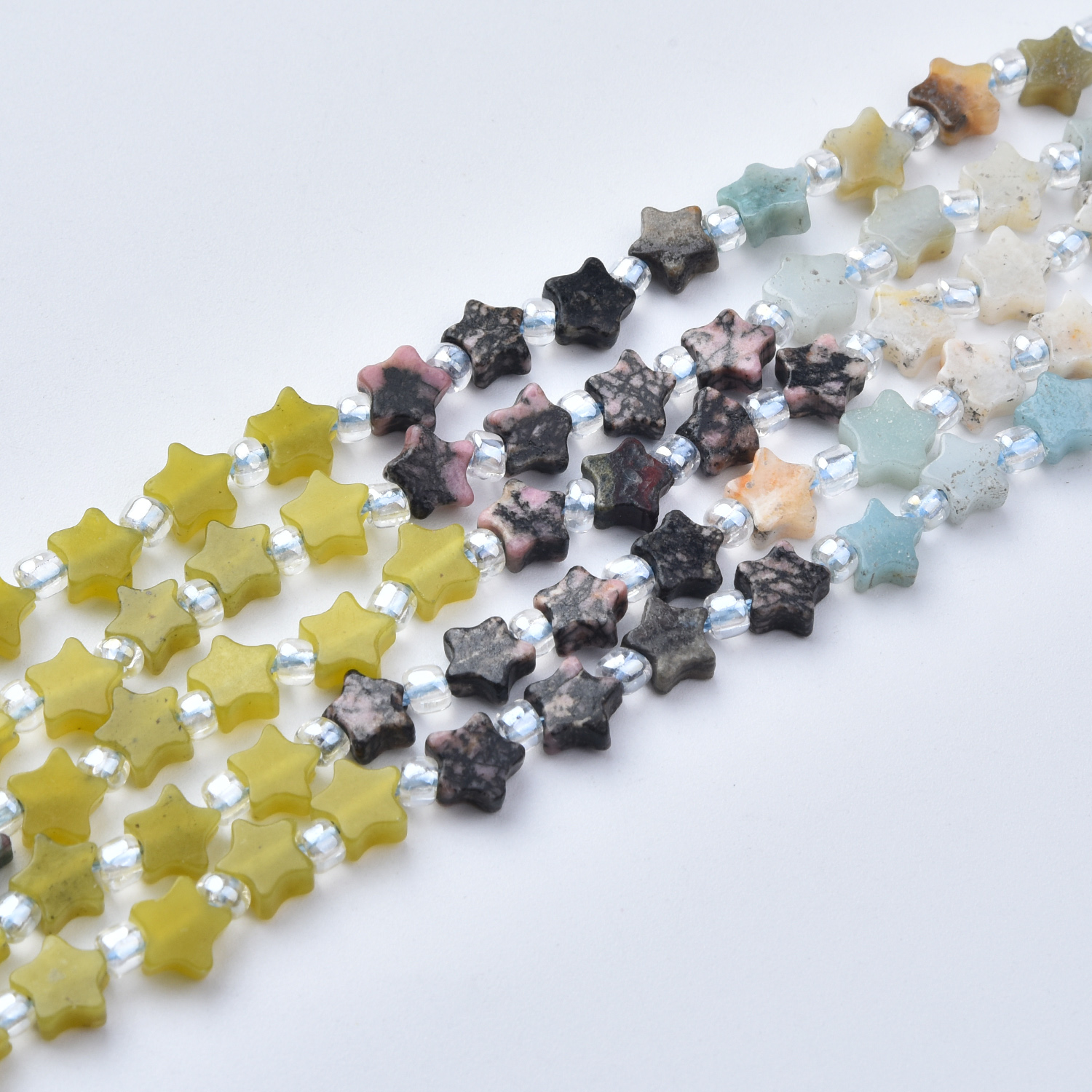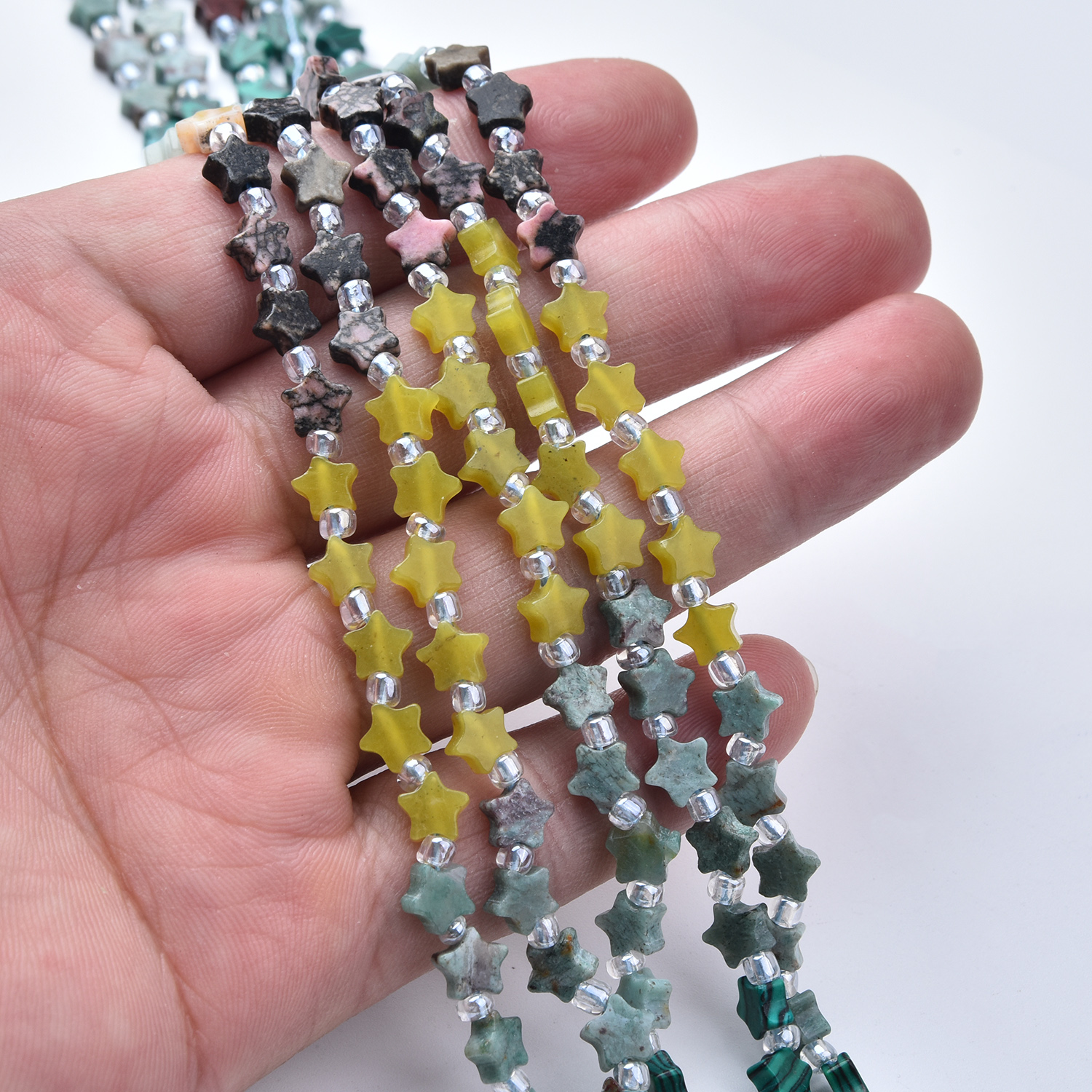 Bring a cosmic vibe to your designs with this 5mm star gemstone bead strand, featuring a stunning mix of banded green Malachite, glowy Opalite, and blue-green African Turquoise-style stones, plus cheerful yellow stars for a bright pop. The star shape makes these perfect for celestial, boho, and modern jewelry.