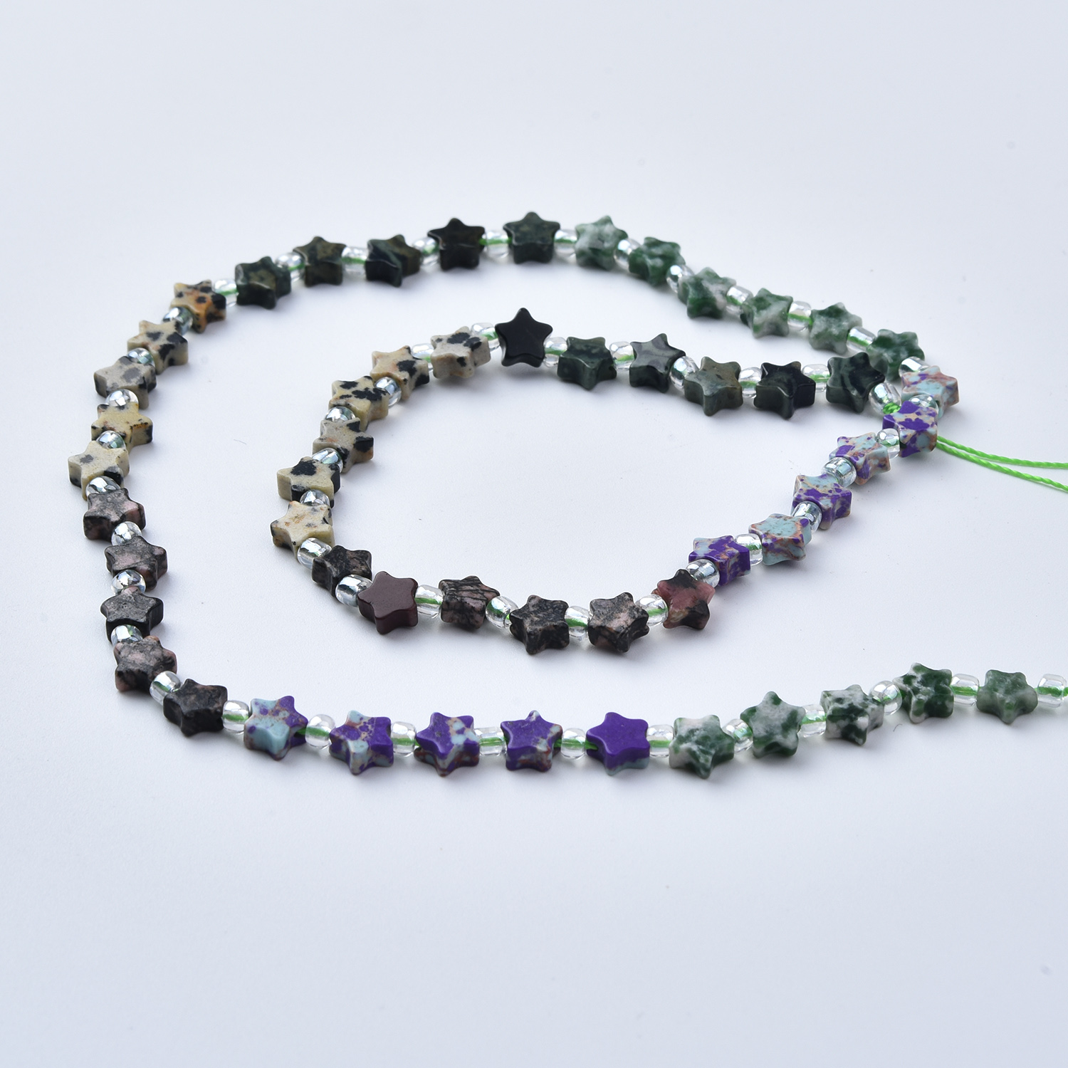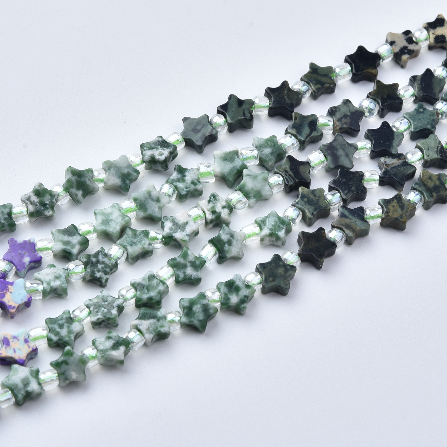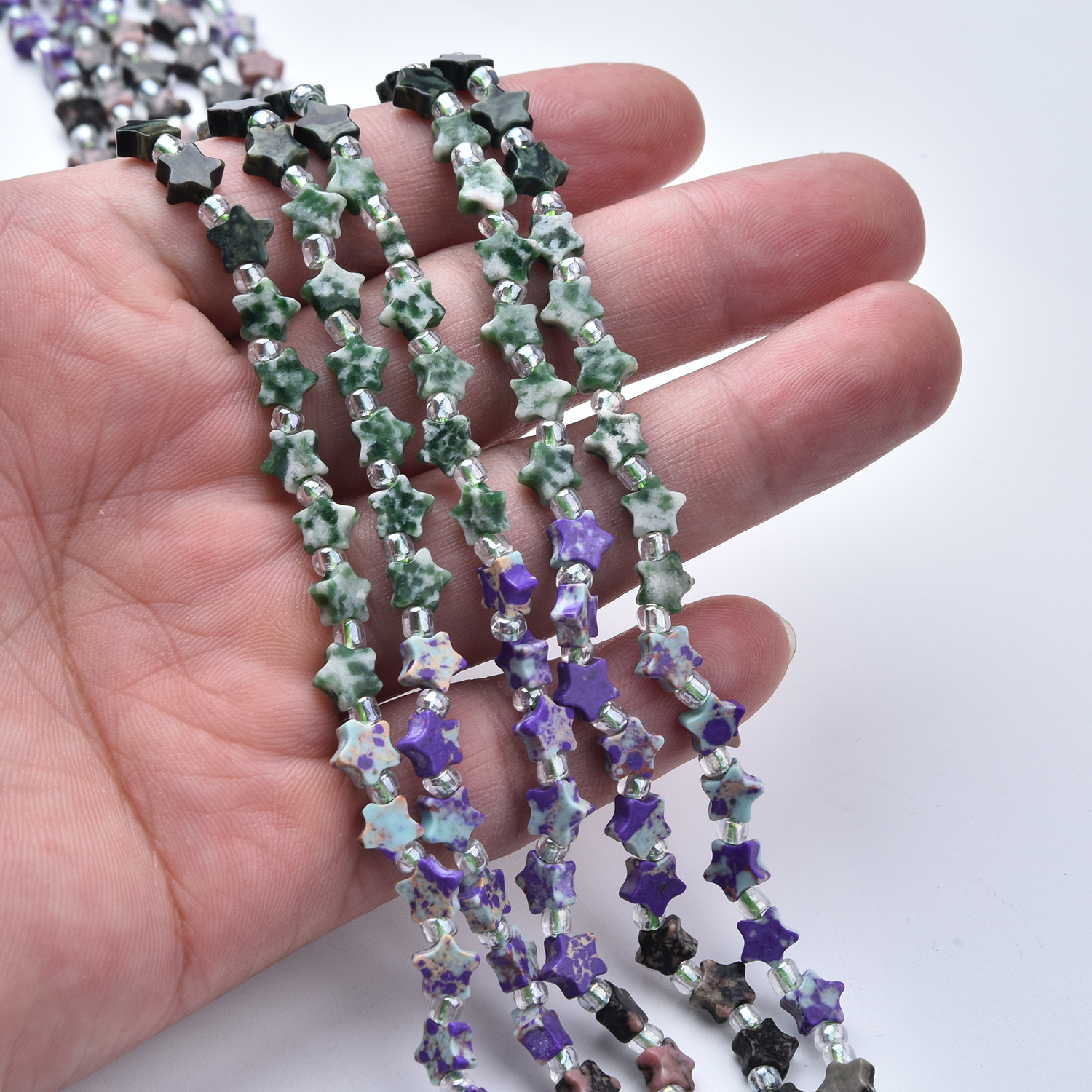 Create unique celestial jewelry with this 5mm star mixed gemstone beads strand—a beautiful blend of greens, earthy neutrals, and speckled stone patterns, finished with shiny spacer beads for extra sparkle. Perfect for boho, earthy, celestial, and nature-inspired designs.