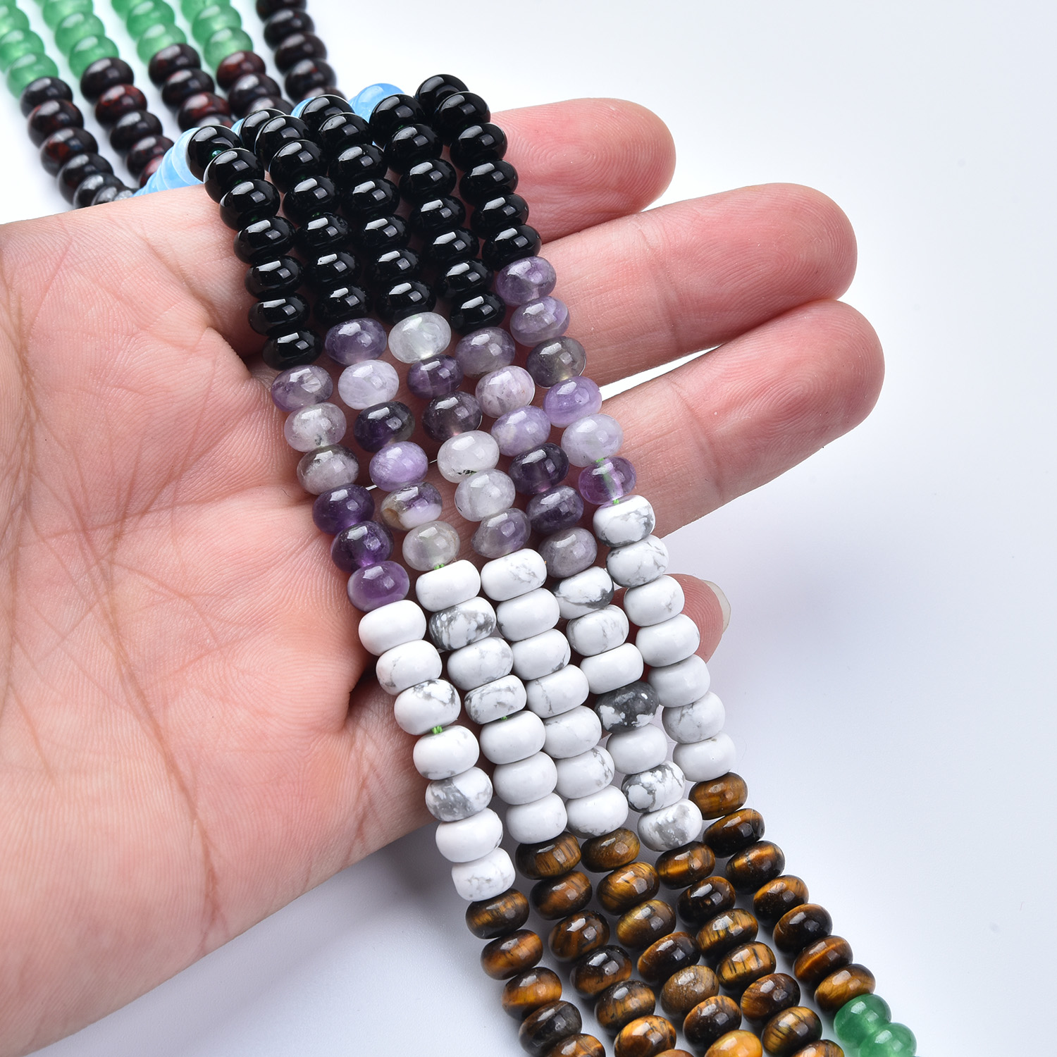 Bring striking color and meaningful energy to your jewelry creations with this 6mm Smooth Rondelle Gemstone Bead Strand Mix (GRN745). This full 15.5″ strand features a bold, earthy-meets-cool palette—ocean blues, forest greens, classic black, warm tiger eye browns, crisp white howlite, and purple accents—perfect for modern color-block designs and statement pieces. ✨