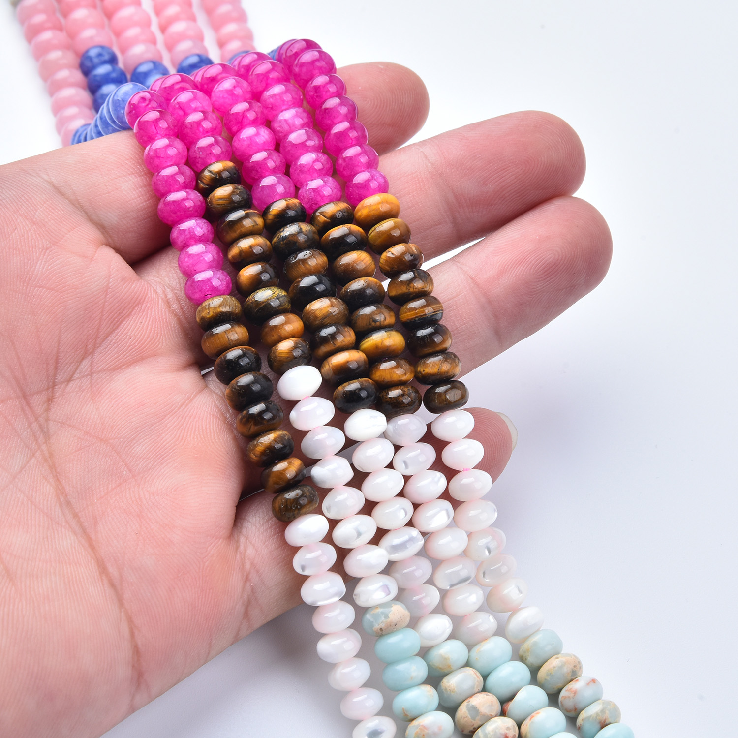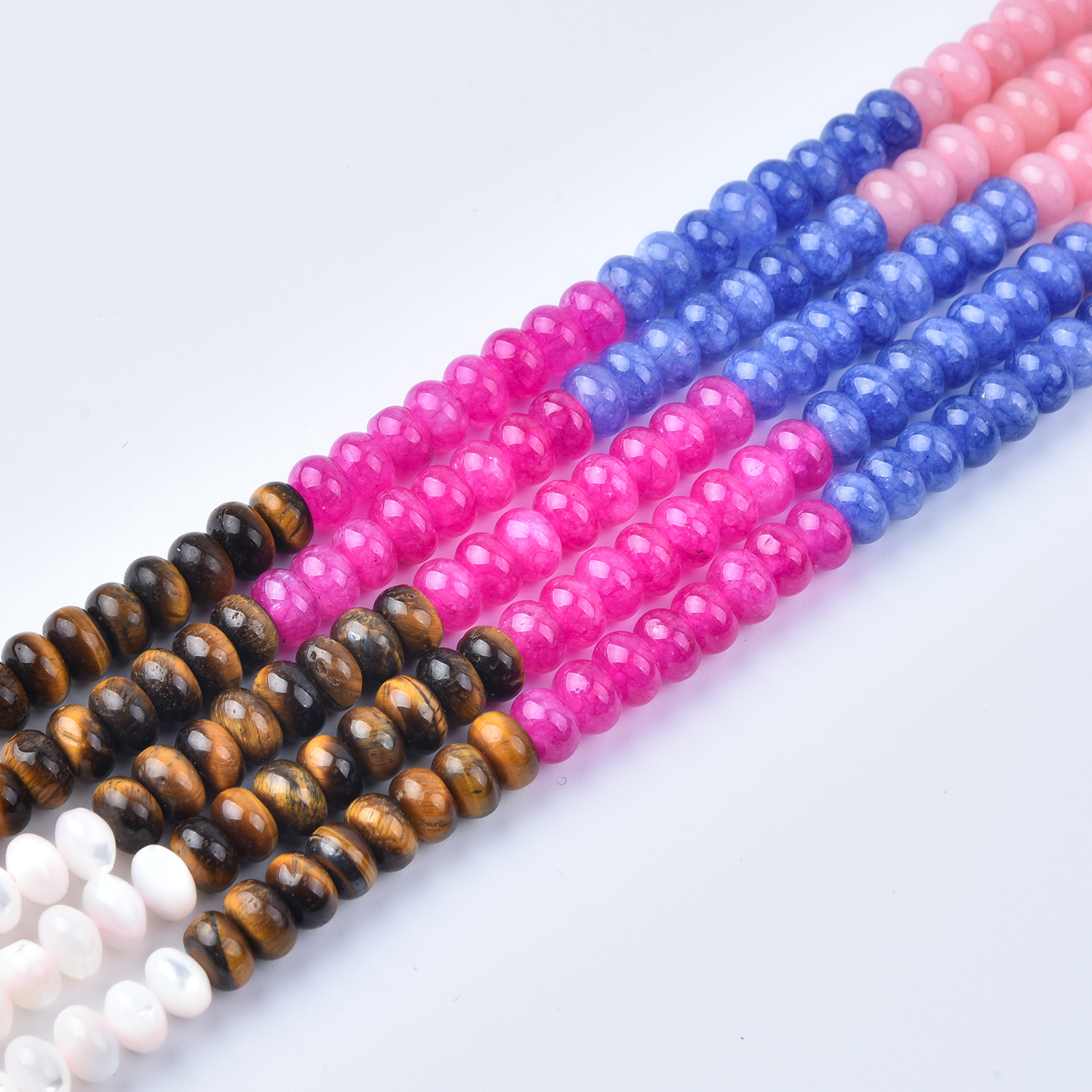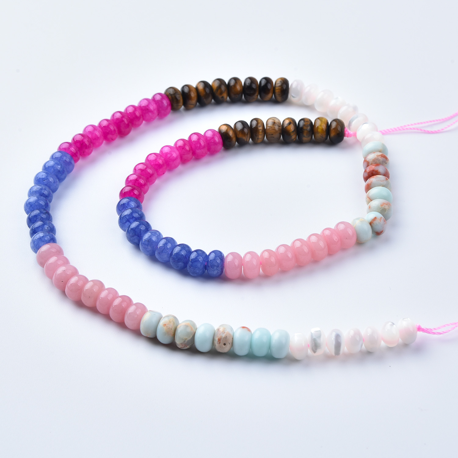 Bring bold, playful color and meaningful energy to your jewelry creations with this 6mm Smooth Rondelle Gemstone Bead Strand Mix (GRN750). This full 15.5″ strand features a fun, trendy palette—hot pinks, soft blush tones, bright blues, creamy whites, warm tiger eye shimmer, and airy aqua accents—perfect for modern color-block designs and statement pieces. ✨