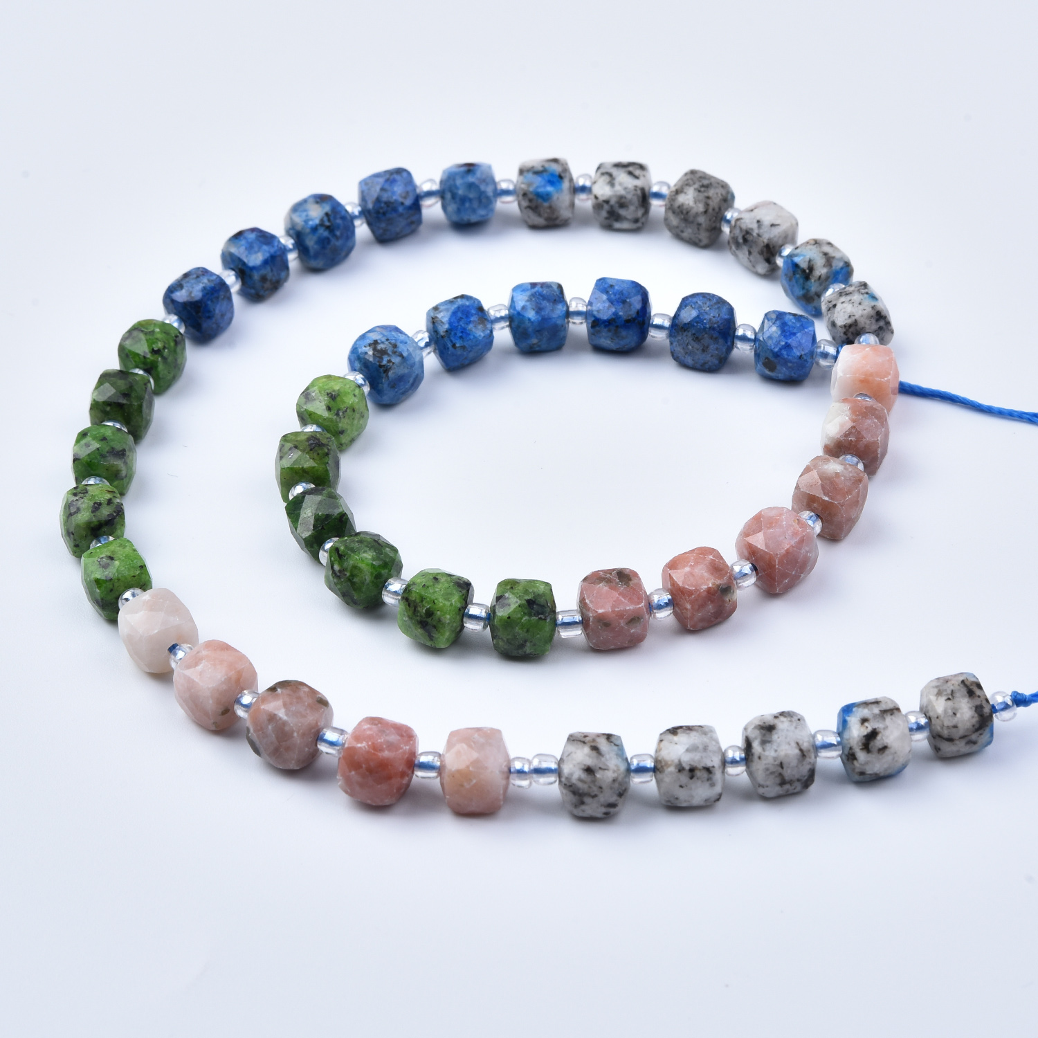 Bring grounded earthy color and natural balance to your jewelry creations with this 7mm Smooth Cube Cut Gemstone Bead Strand Mix (GRN771). This full 15.5″ strand features a rich, nature-inspired palette of deep blue, moss green, soft peach, and speckled gray—perfect for modern boho pieces, unisex designs, and everyday gemstone jewelry. ✨
