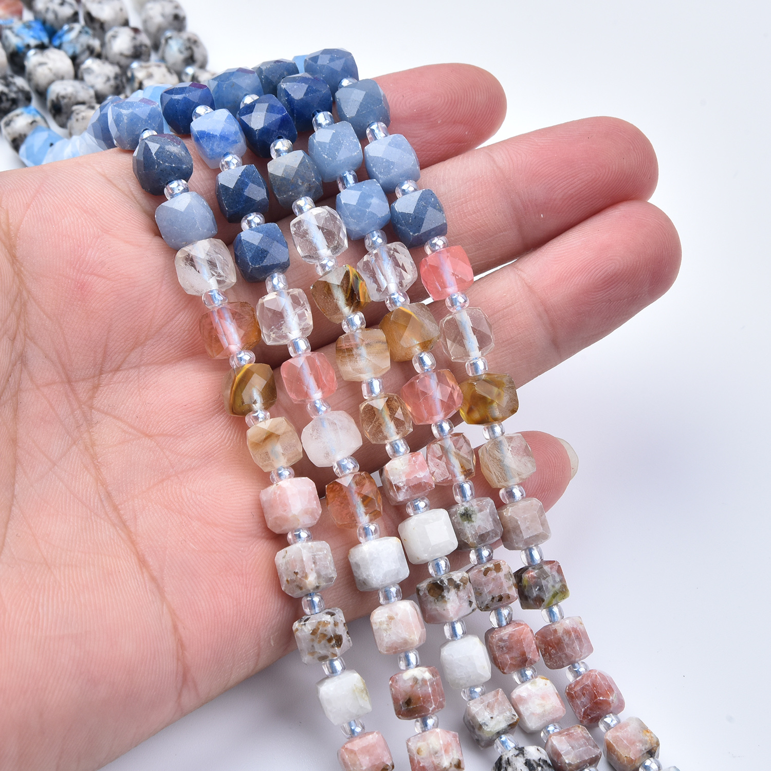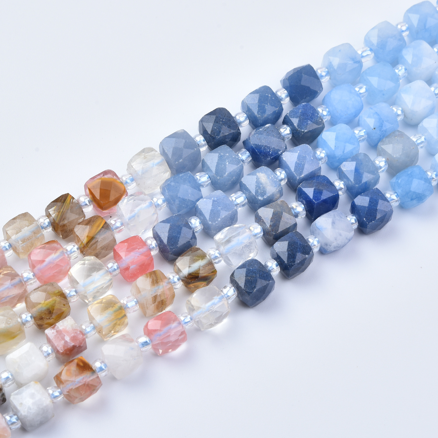 Create calm, modern jewelry designs with this 7mm Smooth Cube Cut Mixed Gemstone Bead Strand (GRN762). This full 15.5-inch strand features a refreshing blend of cool blues, soft grays, milky white, gentle pink, and warm honey accents—perfect for boho jewelry, coastal-inspired designs, minimalist styles, and everyday gemstone pieces.