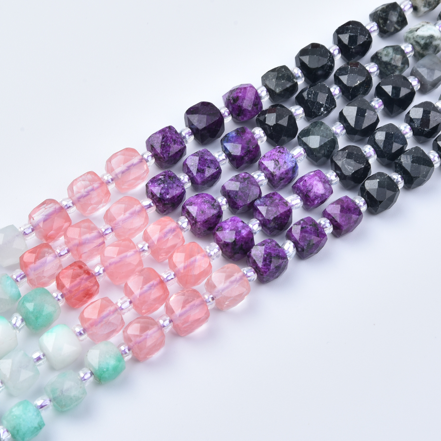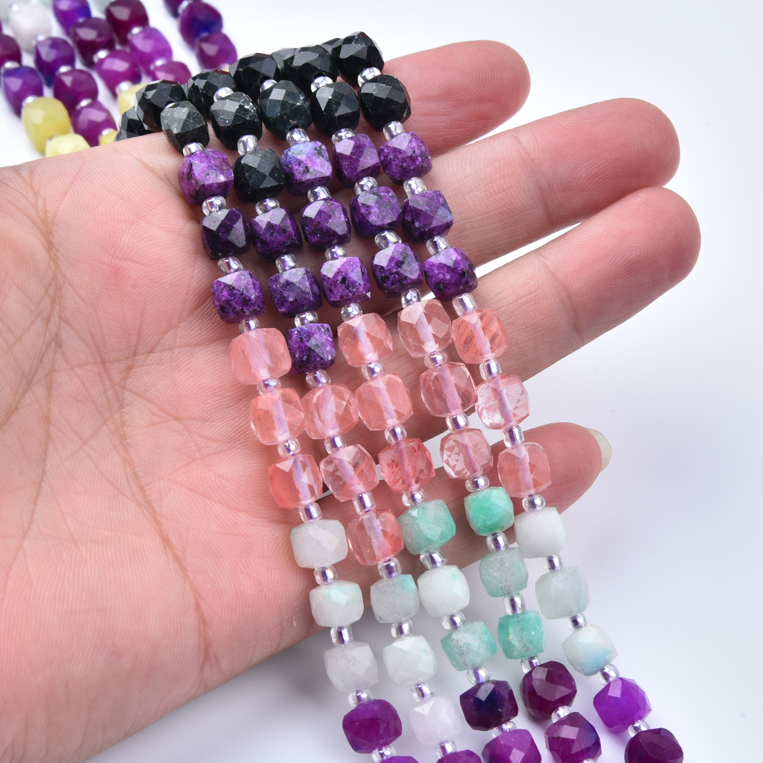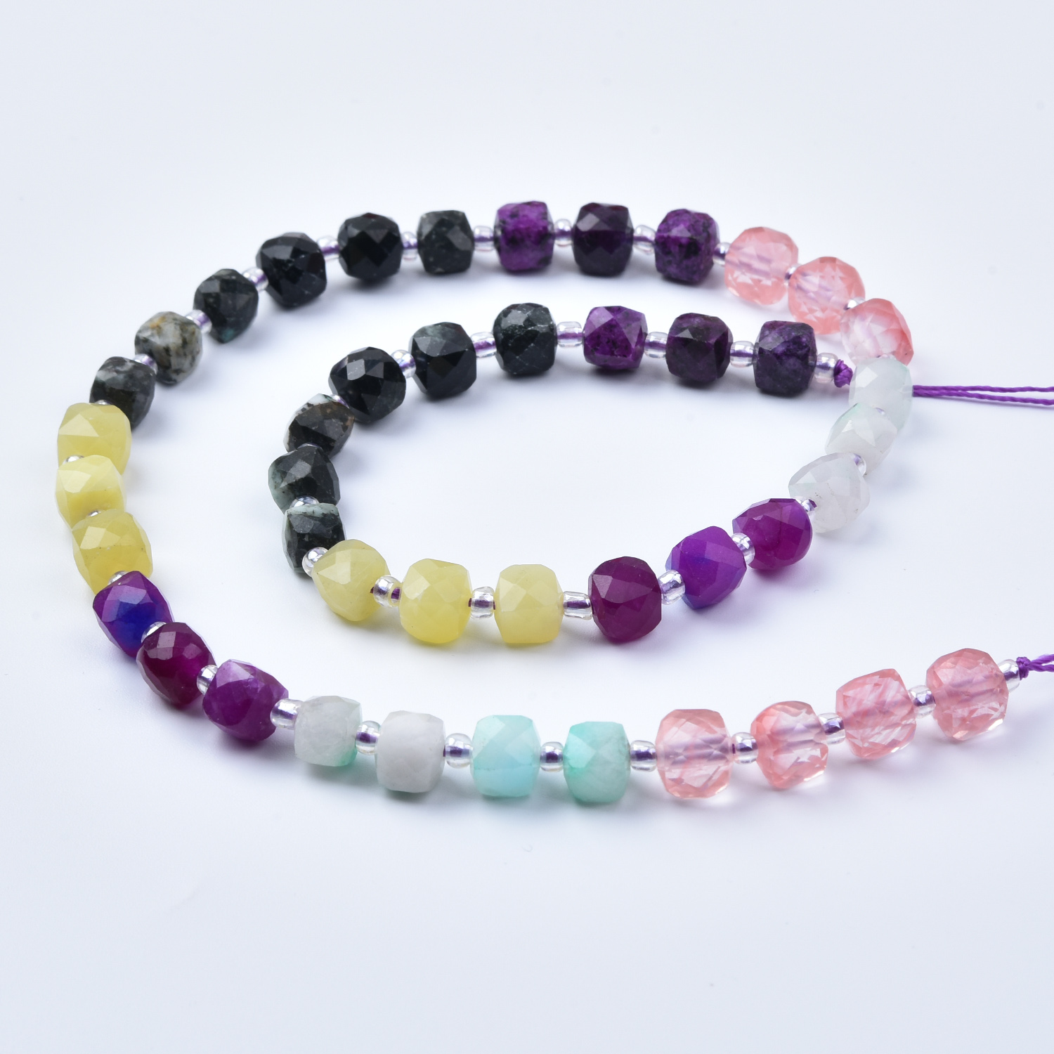 Add vibrant color and balanced natural energy to your jewelry designs with this 7mm Smooth Cube Cut Mixed Gemstone Bead Strand (GRN763). This full 15.5-inch strand features a lively yet well-coordinated palette of black, purple, yellow, green, white, and blush pink—perfect for boho jewelry, creative statement pieces, layered designs, and everyday gemstone accents.