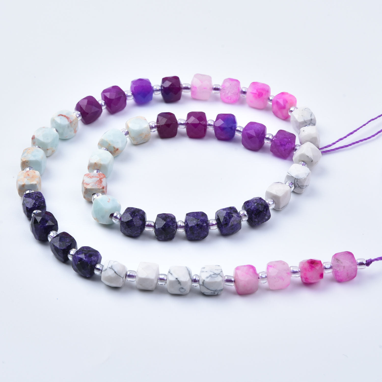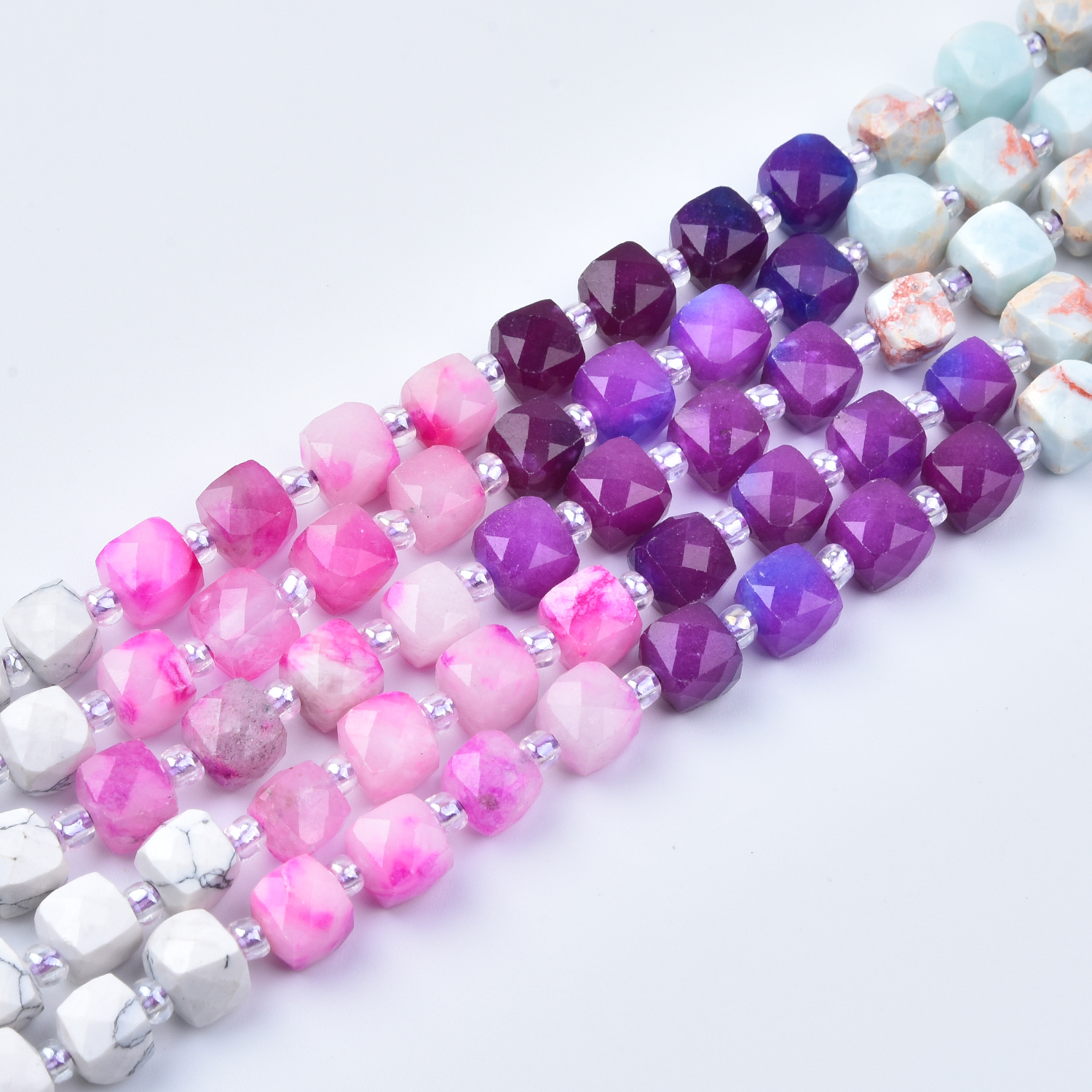 Add romantic color and soft contrast to your jewelry designs with this 7mm Smooth Cube Cut Mixed Gemstone Bead Strand (GRN766). This full 15.5-inch strand blends rich purples, blush pinks, milky white, and pale aqua accents—perfect for boho jewelry, feminine designs, statement bracelets, and meaningful handmade gifts.