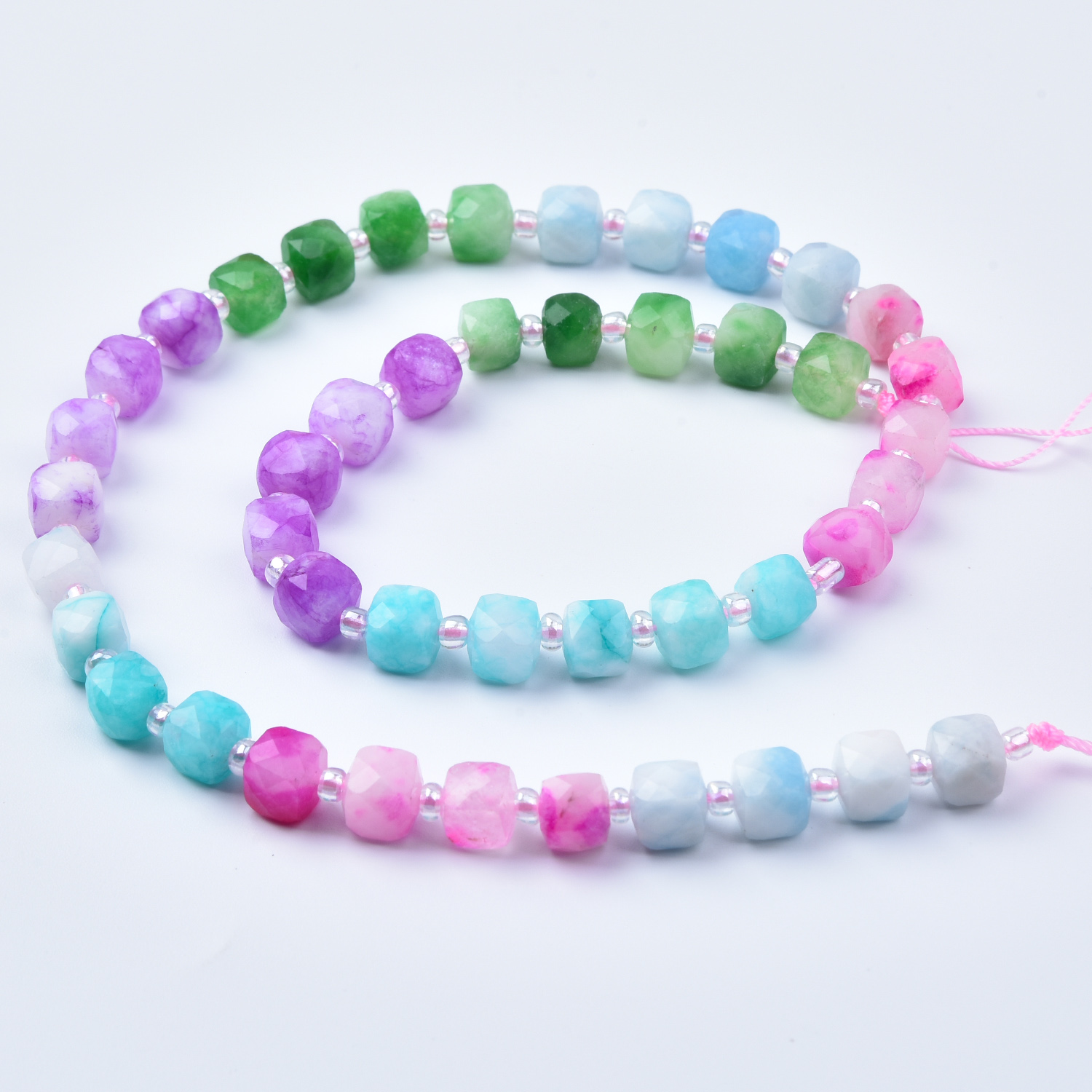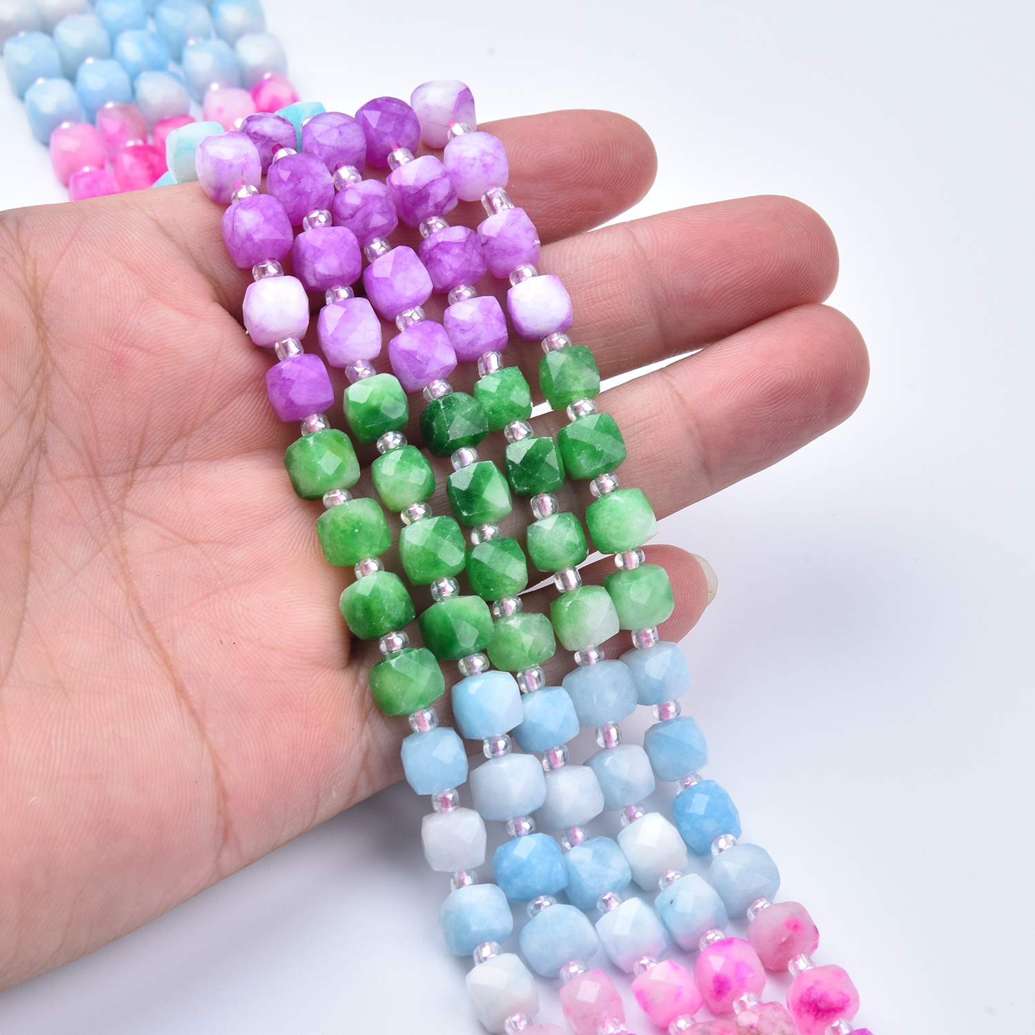 Add playful color and uplifting energy to your jewelry designs with this 7mm Smooth Cube Cut Mixed Gemstone Bead Strand (GRN765). This full 15.5-inch strand features a bright yet soft pastel rainbow palette—greens, blues, purples, pinks, and milky white—perfect for boho jewelry, spring and summer designs, layering pieces, and cheerful handmade gifts.