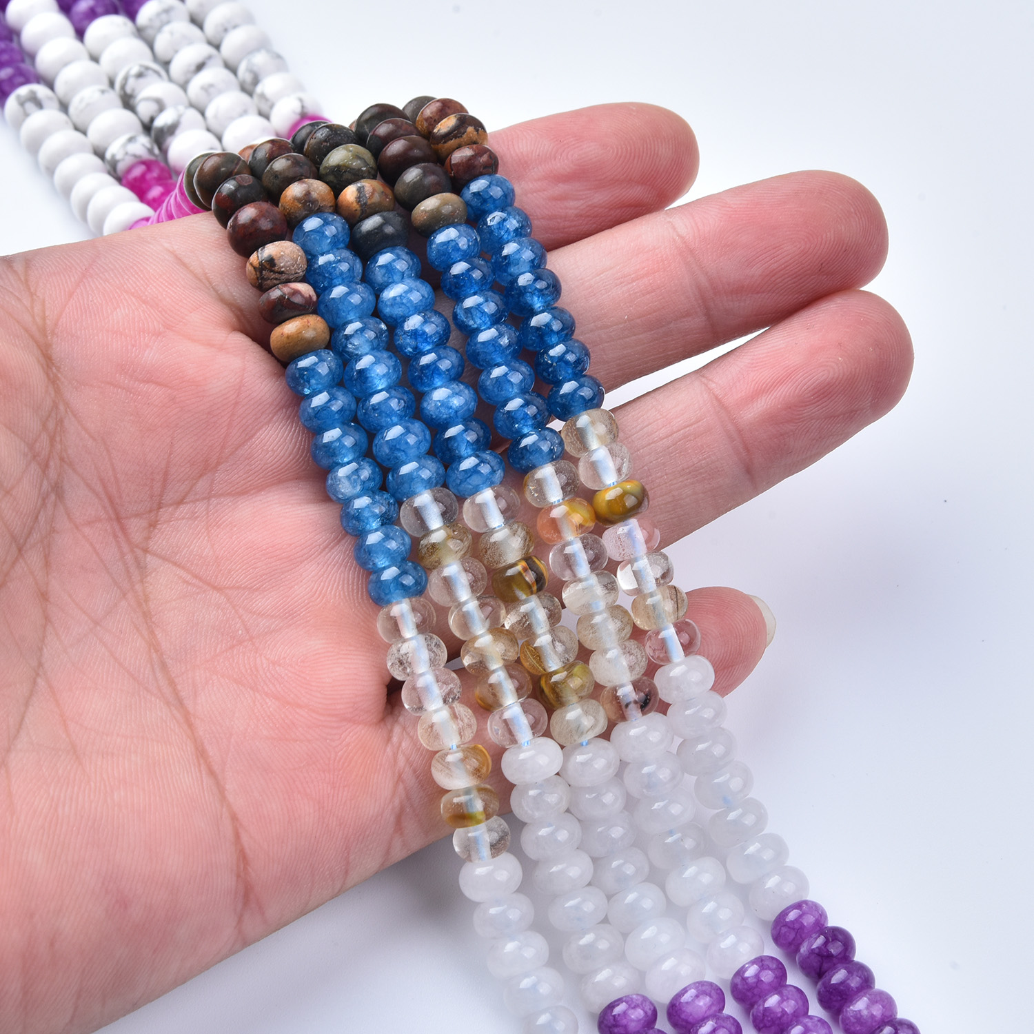 Bring striking color and meaningful energy to your jewelry creations with this 6mm Smooth Rondelle Gemstone Bead Strand Mix (GRN738). This full 15.5″ strand features a playful, high-contrast palette—bright pinks, deep purples, ocean blues, crisp whites, and earthy browns—perfect for bold statement pieces or fun color-block designs. ✨