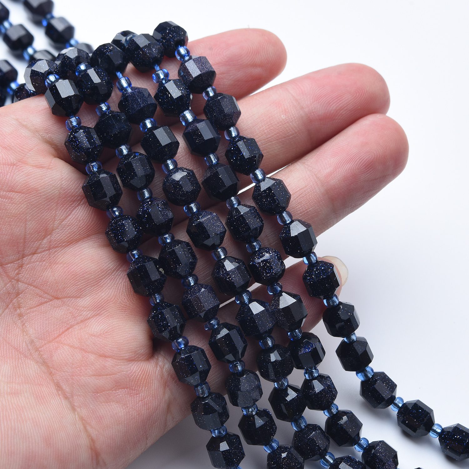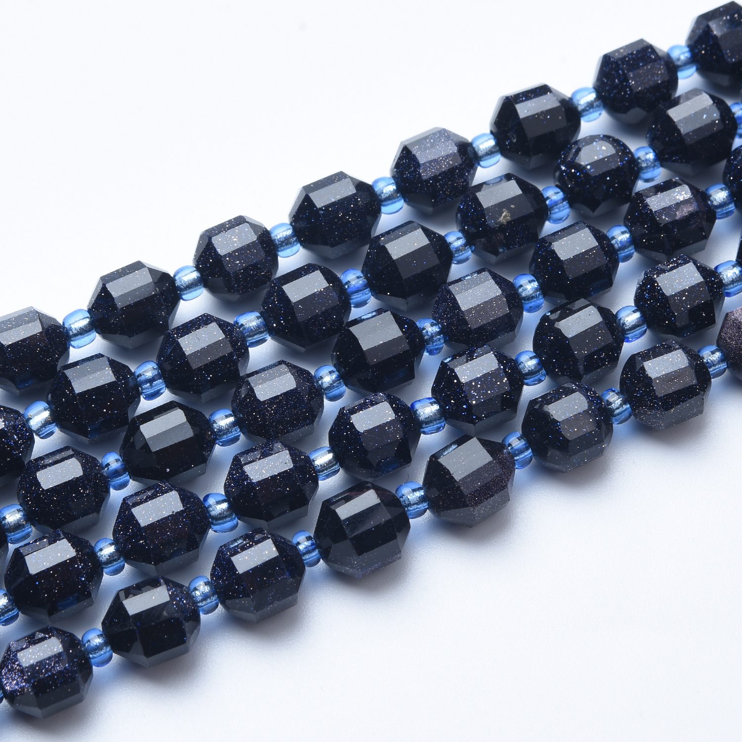 Bring a touch of sparkle and elegance to your jewelry creations with these stunning Blue Sandstone Faceted Beads. Also known as Blue Goldstone, this man-made gemstone is prized for its deep midnight blue color filled with glittering specks that resemble a starry night sky.