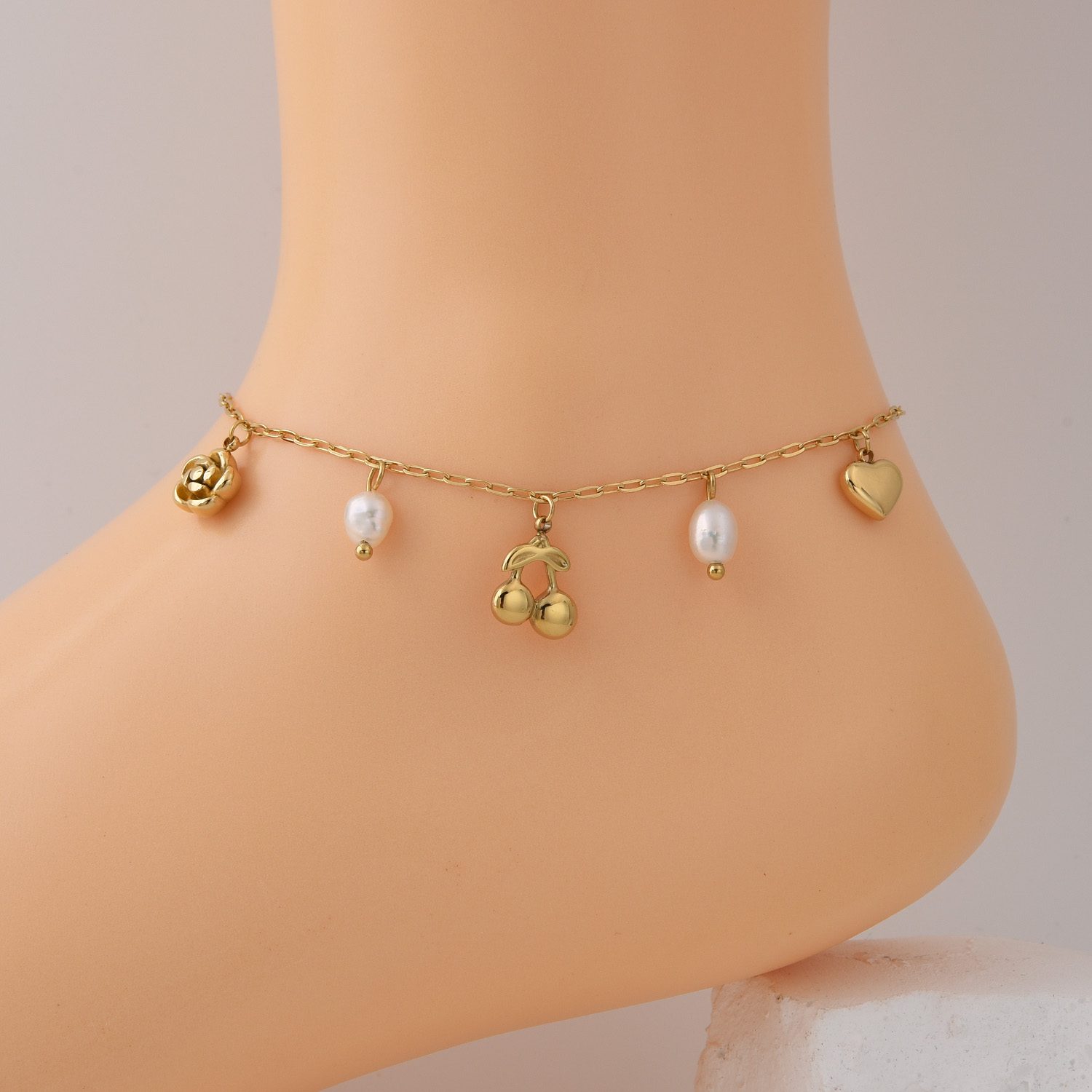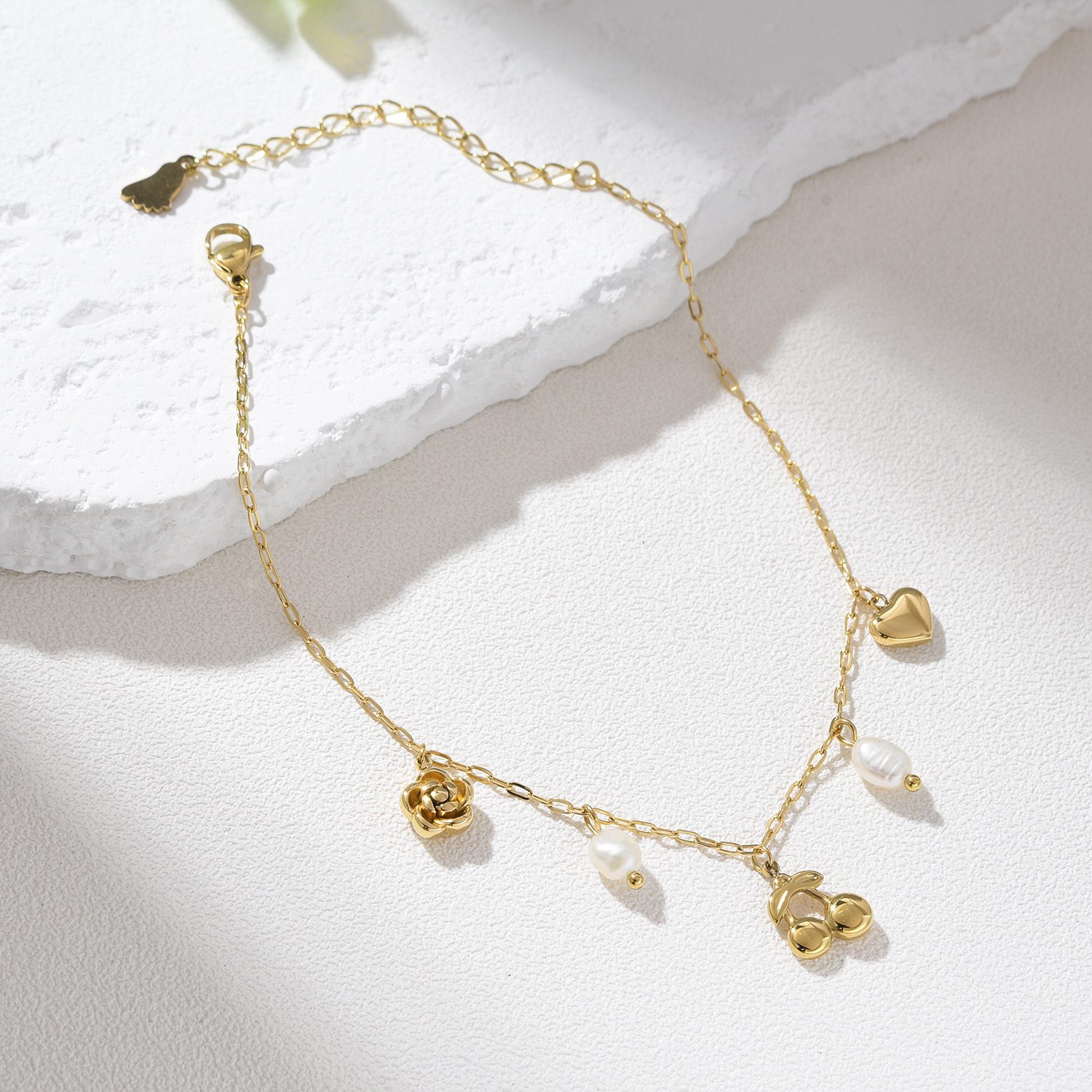 Gold Filled Anklet with Pearl, Heart, Rose and Cherry Charms, Adjustable Chain Bracelet, Cute Gold Ankle Jewelry Gift for Women, AL036