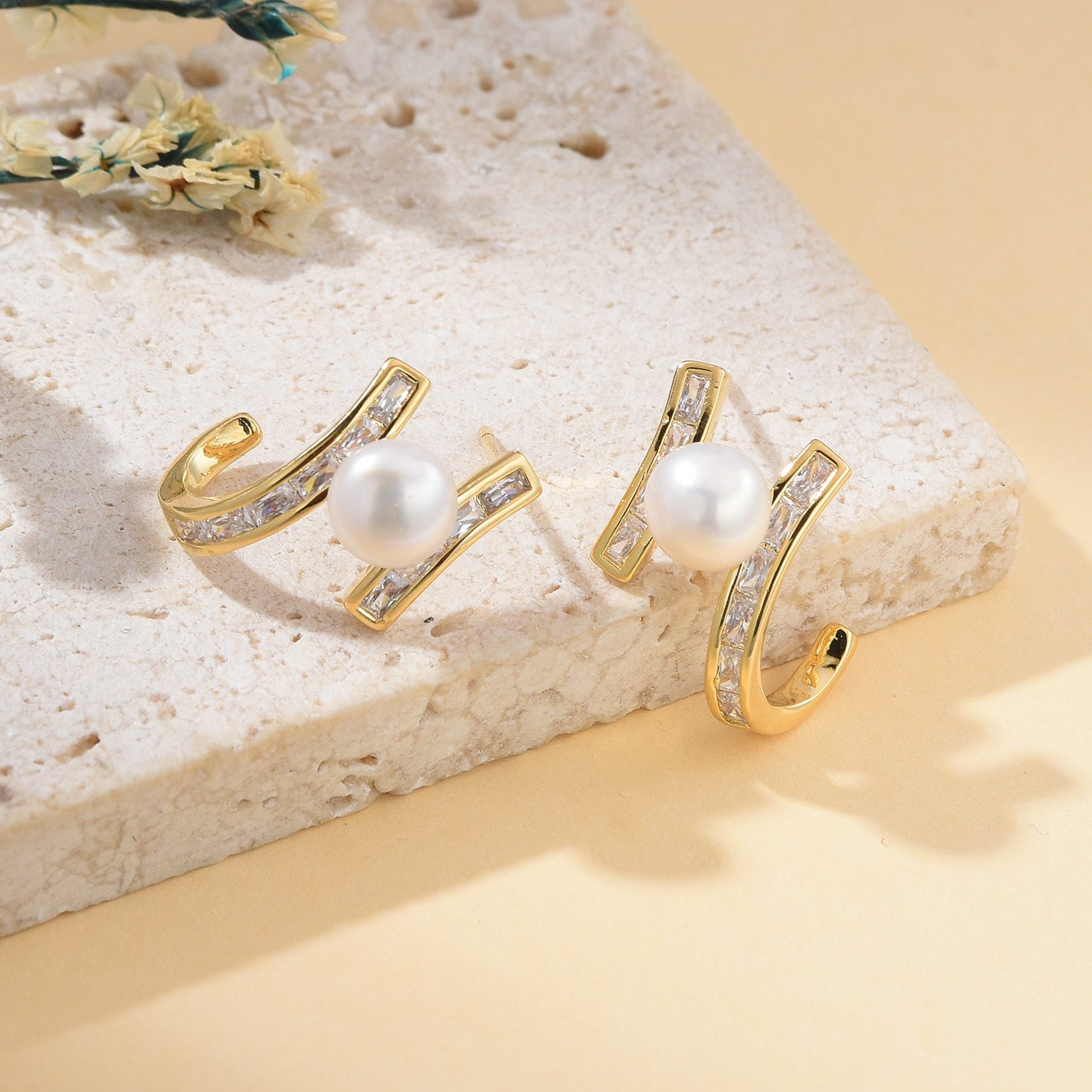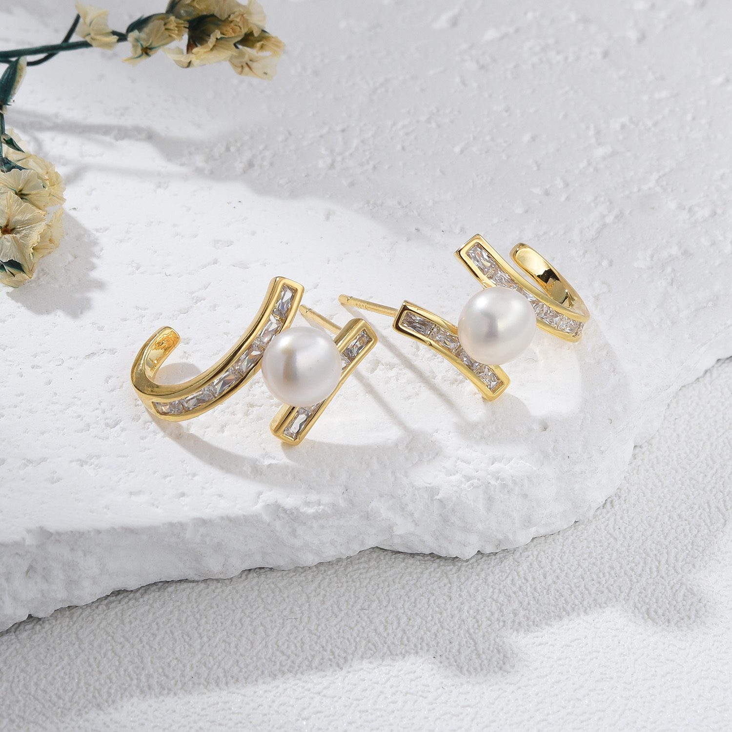 Material: 925 Sterling silver post, Gold plated brass, Cubic Zirconia, Pearl