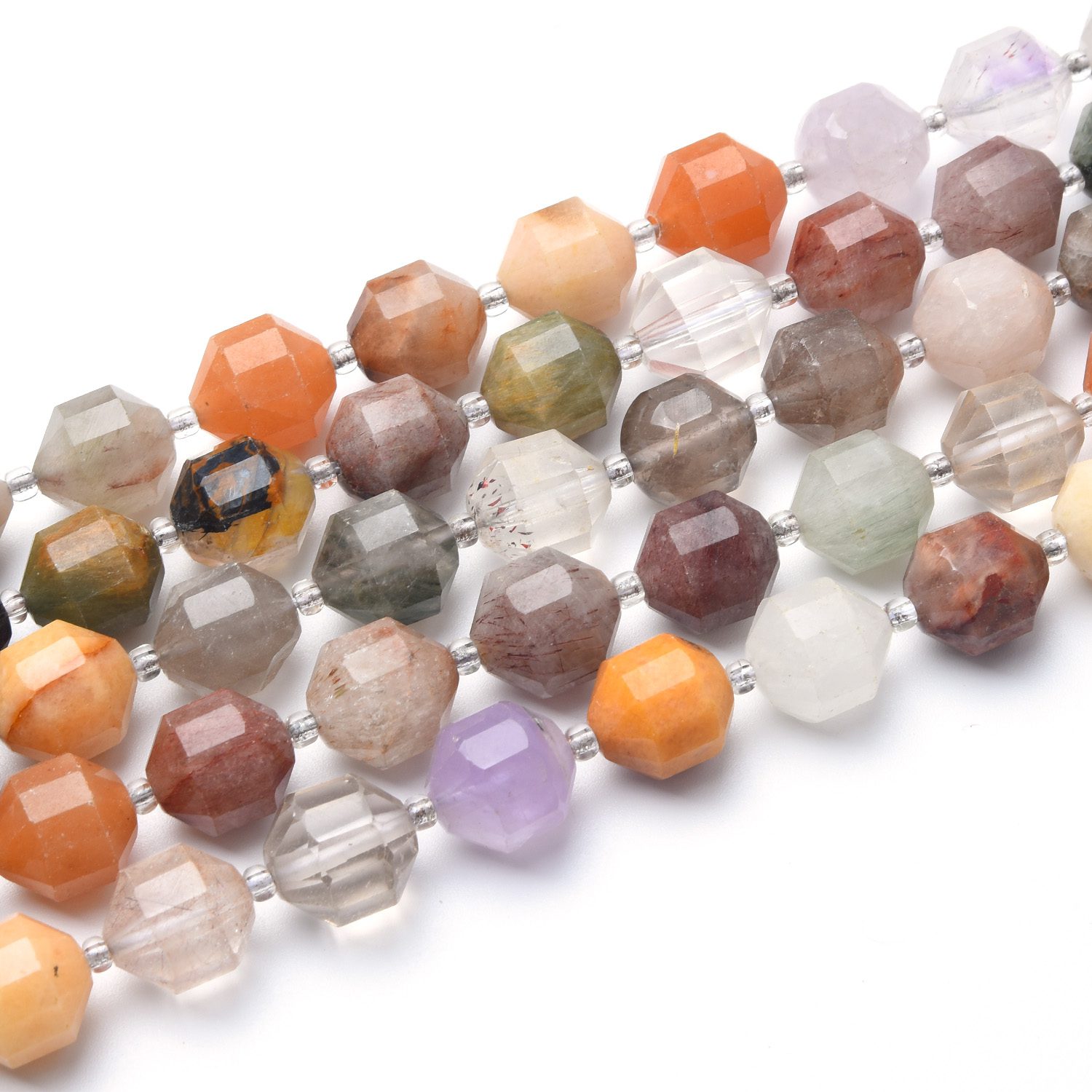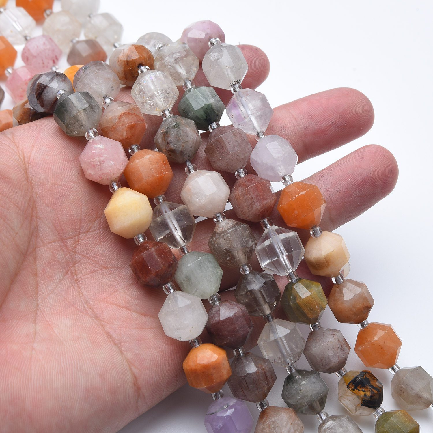 Each strand includes a natural variety of quartz tones, enhanced by the faceted prism cut that reflects light beautifully. The mix of sizes adds dimension, making them perfect for statement necklaces, bracelets, earrings, or combining with other gemstones.