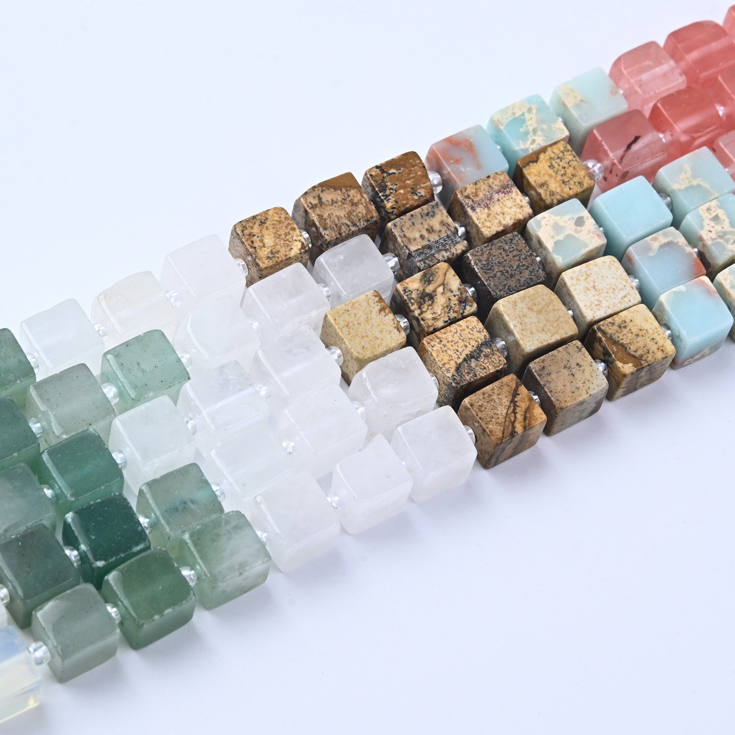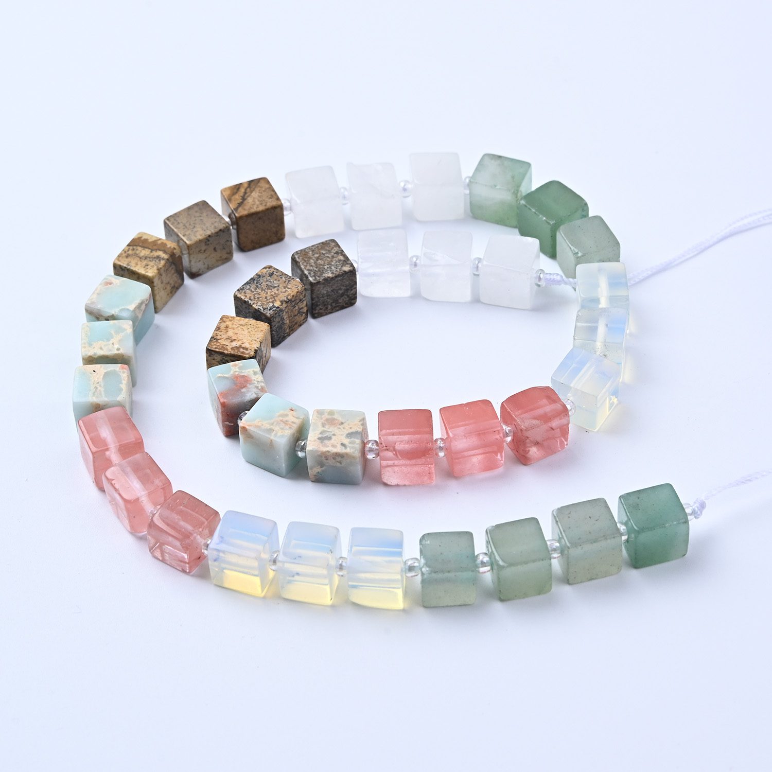 This collection offers a harmonious color palette of soft pinks, earthy tones, and soothing greens. The uniform smooth cube shape is versatile for modern, stackable jewelry. It’s a complete toolkit for makers who want to create pieces that promote specific, positive intentions.