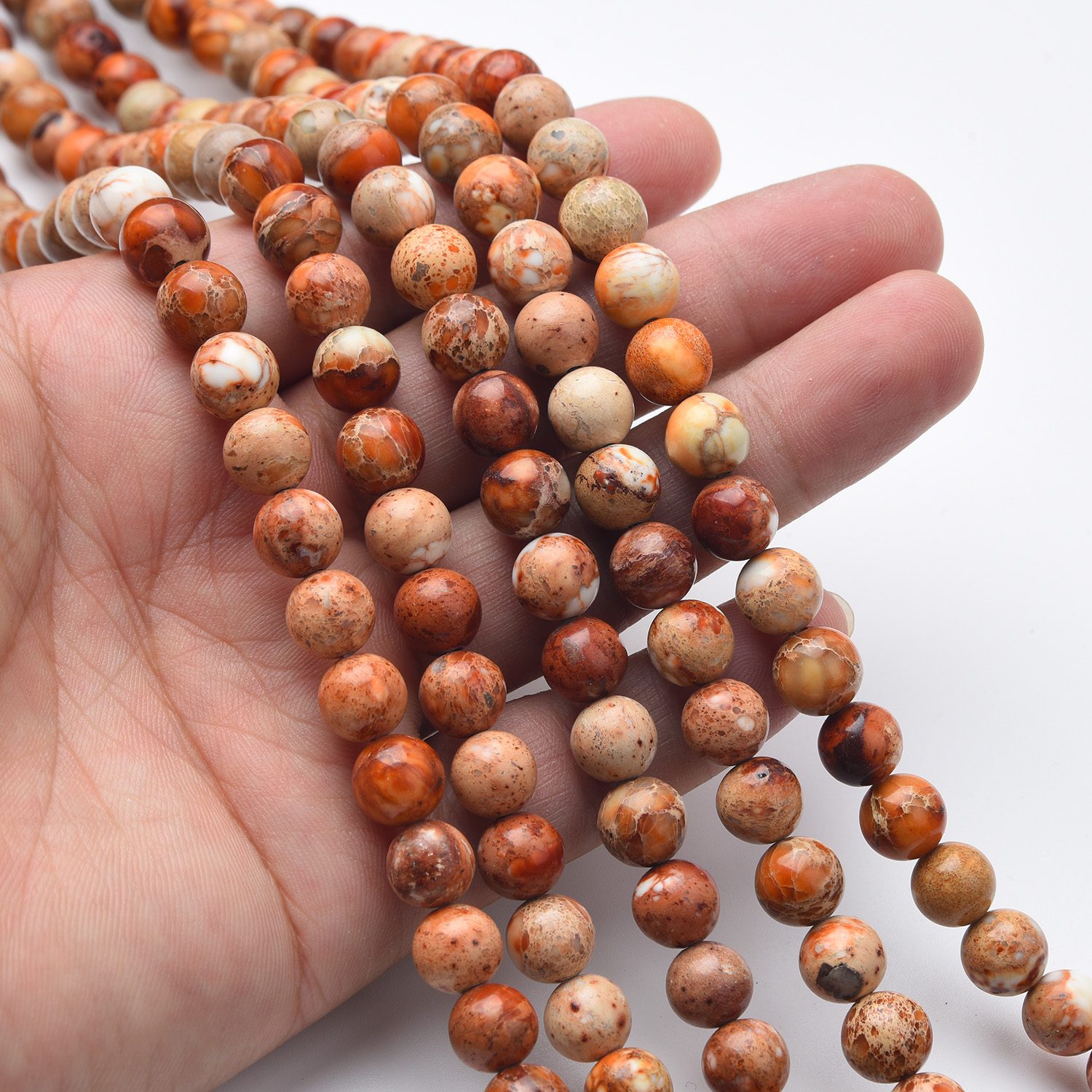 Bring warmth and natural elegance to your creations with these Earth-Tone Imperial Jasper Gemstone Beads. Each 8mm round bead features beautiful veined patterns in shades of beige, brown, orange, and red, polished to a glossy smooth finish that enhances their organic beauty. 🌿✨