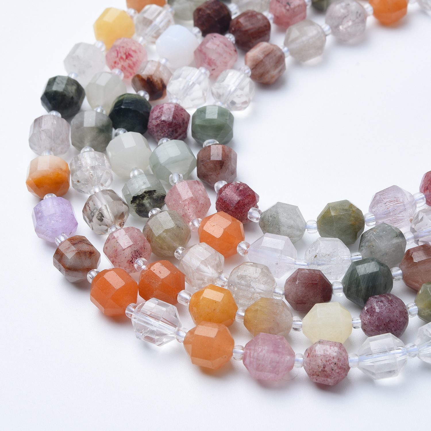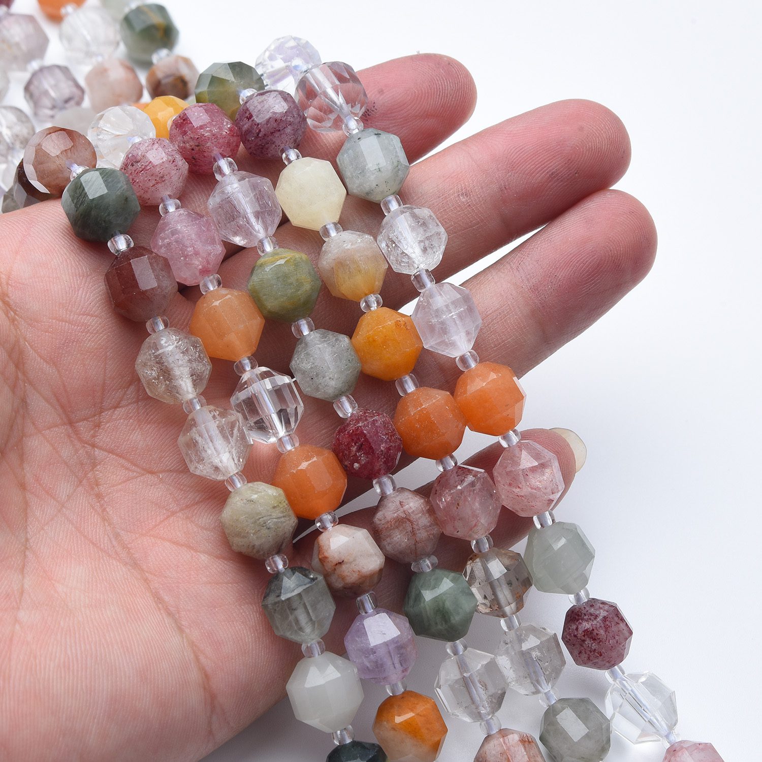 Each strand includes a natural variety of quartz tones, enhanced by the faceted prism cut that reflects light beautifully. The mix of sizes adds dimension, making them perfect for statement necklaces, bracelets, earrings, or combining with other gemstones.