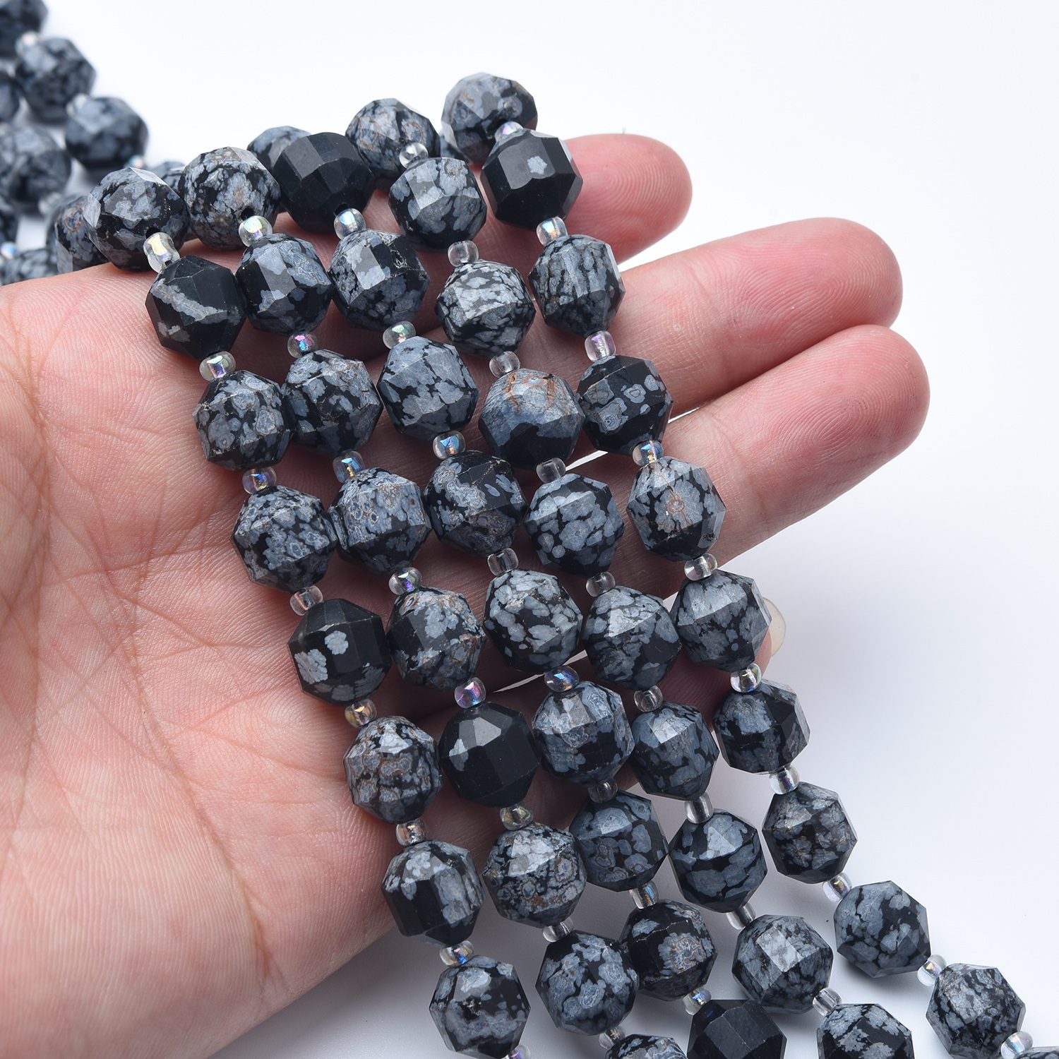 Each bead features unique black and gray “snowflake” patterns with a glossy faceted surface that reflects light beautifully. Perfect for necklaces, bracelets, earrings, or mixing with other gemstones for distinctive designs.