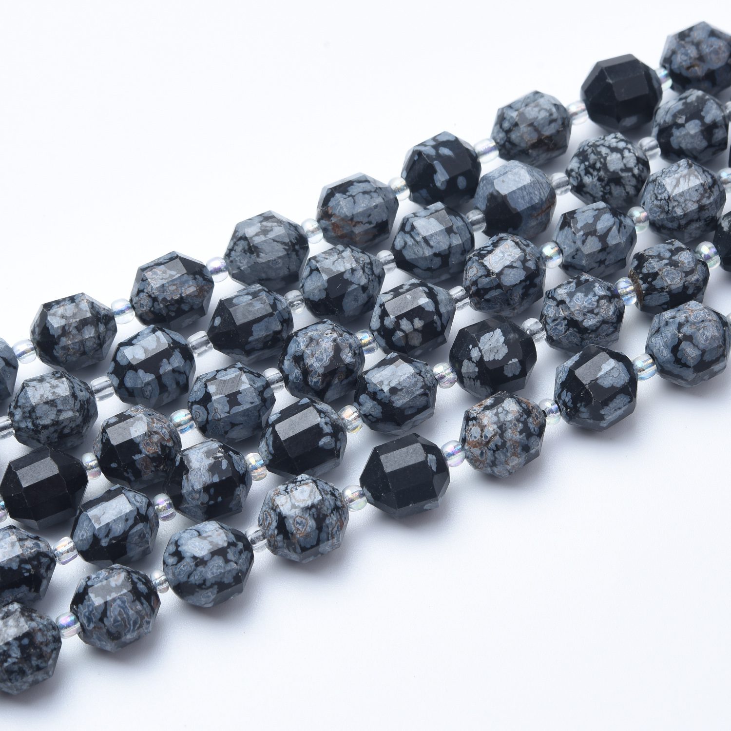 Add bold contrast and grounding energy to your jewelry creations with these Snowflake Obsidian Faceted Prism Cut Beads. Known as a stone of balance and protection, Snowflake Obsidian is believed to help release stress, encourage clarity, and promote inner peace.